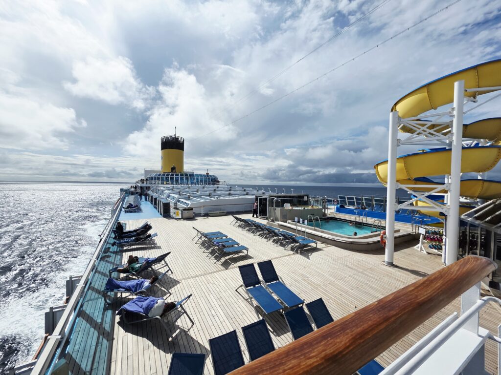 De buitenbaden zijn leeg vanwege de wind, maar uit de wind met een jas aan, kunnen we prima buiten koffiedrinken. Je ziet wel goed hoe het schip omhoog en omlaag gaat hier.
