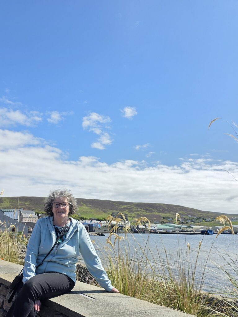We gaan vanaf de boot het stadje Lerwick op de film/foto zetten. Heel herkenbaar omdat we de serie “Shetland” volgen. Het is inmiddels wel bewolkt, maar lekker genoeg om buiten op het terras nog een koffietje te doen. We zien zelfs nog een zeehondje zwemmen, helaas duikt hij onder als ik mijn camera startklaar heb. Om 11 uur moeten op 3 zijn voor de excursie.