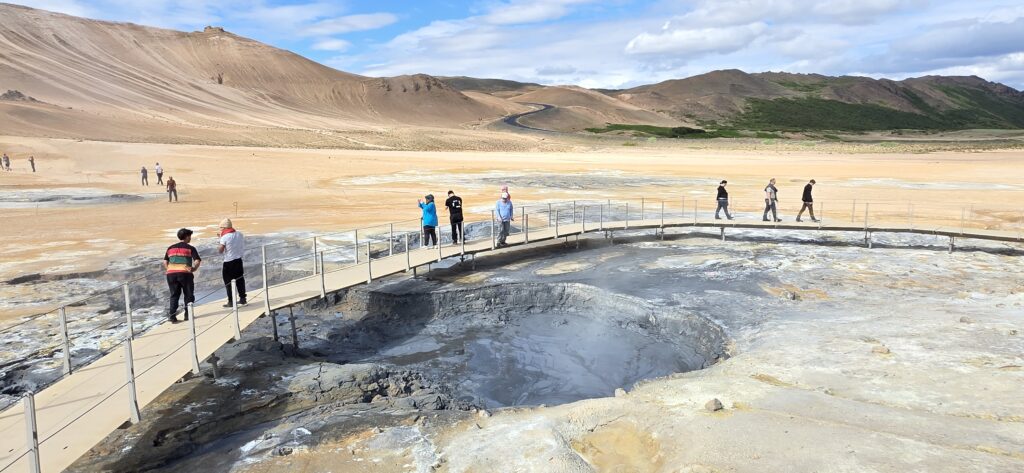 De volgende stop, een zeer mooie bezienswaardigheid is Hverir. Een geothermische lokatie met stoompluimen en pruttelende modderpoel met lekkere zwaveldampen. Het lijkt wel buitenaards, prachtige kleuren ook. Een klein stukje verder ligt het kleine vulkaanmeertje Krafla.